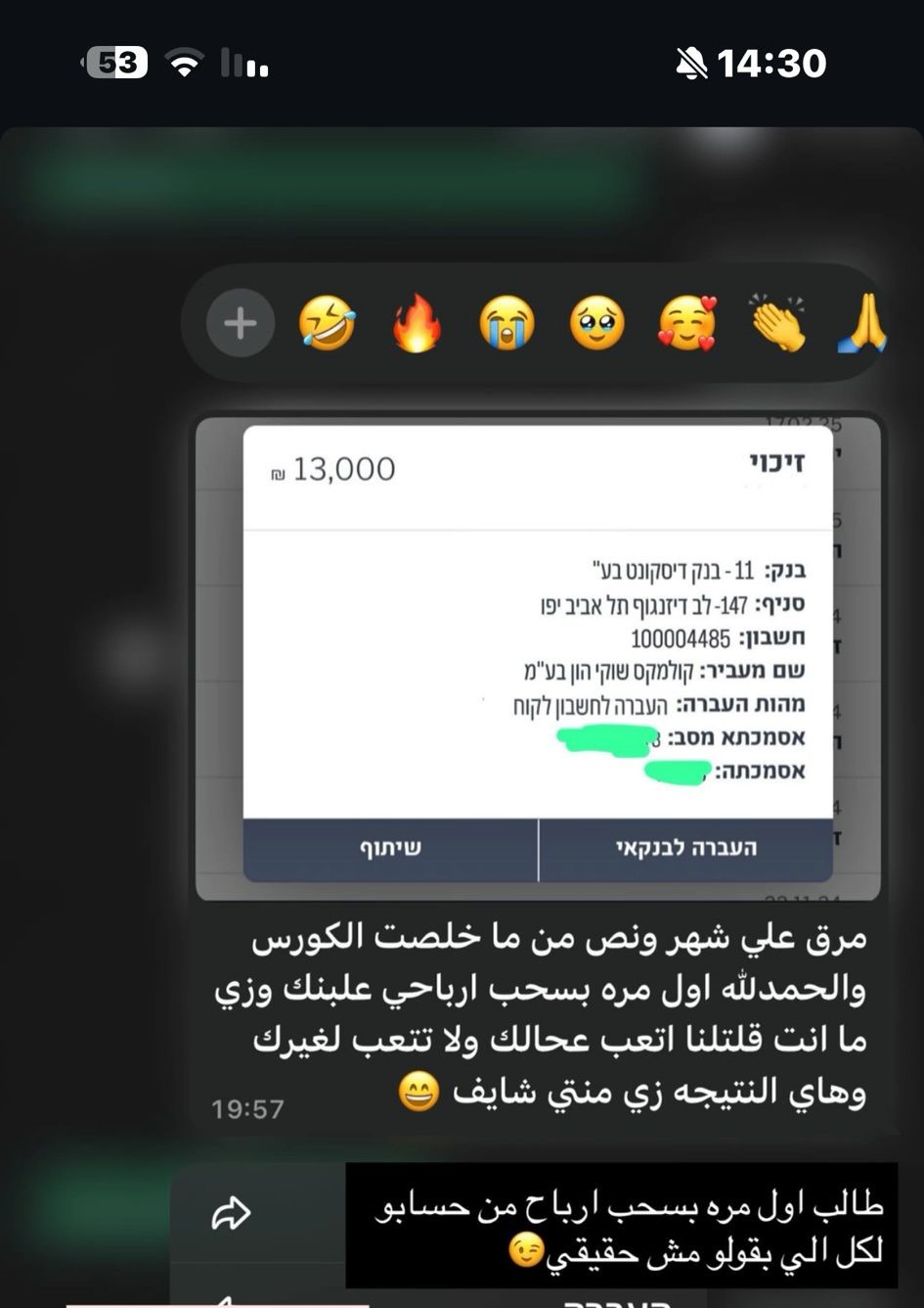 كنت أتابع السوق من بعيد وأحاول أفهم لحالي بس دايمًا أخسر وقتي وما أوصل لنتيجة بعد ما دخلت الكورس كل شي اختلف تعلمت كيف أشتغل صح وأخيرًا بديت أحقق أرباح حقيقية حسّيت لأول مرة إنو تعبي مرحش عالفاضي